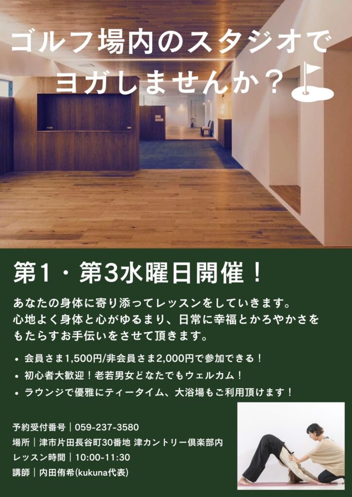 もうすぐ2年になりますが、津市にあるゴルフ場に内にあるスタジオでヨガレッスンをさせて頂いています。