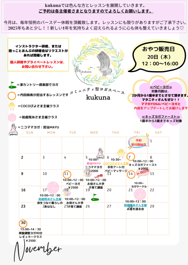 kukunaでは、様々なレッスンがスタートしています!!ご予約は、各主催者さまへお願いいたします。(※ニコママヨガは、kukuna主催となります。)
