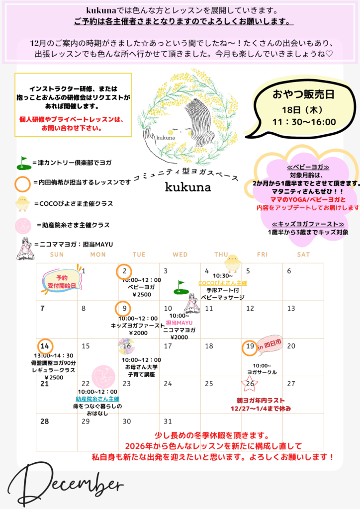 kukunaでは、様々なレッスンがスタートしています!!ご予約は、各主催者さまへお願いいたします。(※ニコママヨガは、kukuna主催となります。)